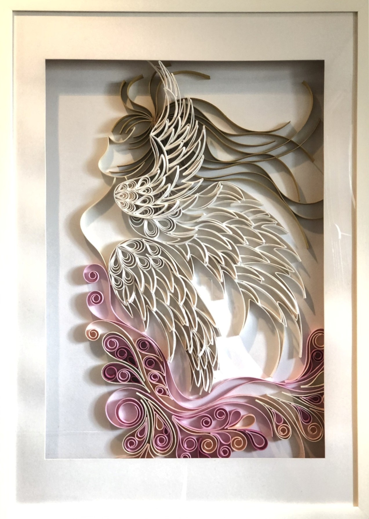 空へ(女神の飛翔) かみばんどアート紙バンドを素材に生み出される、かみばんどアートの作品集です。私が描く文様を立体として紡ぎ出し、工芸と芸術が交差する表現を形にしました。その静謐な世界をご覧いただければ幸いです。 2025.09.032025.12.04 作品名/空へ(女神の飛翔)2018年制作サイズ/76cm×55cm かみばんどアート作品№12 〈作品紹介〉 しなやかな紙バンドが描くこの作品は、空へと羽ばたく女神の姿。優雅に広がる三つの翼は、自由への憧れ、希望、そして新たな旅立ちを象徴しています。一本一本の紙バンドが織りなす流れるような曲線は、風に乗る軽やかさと、内に秘めた強さを表現。光を受けて生まれる影が、女神の軌跡を静かに映し出します。この作品が、あなたの心にもそっと翼を広げ、新たな未来へと導くきっかけになれば幸いです。