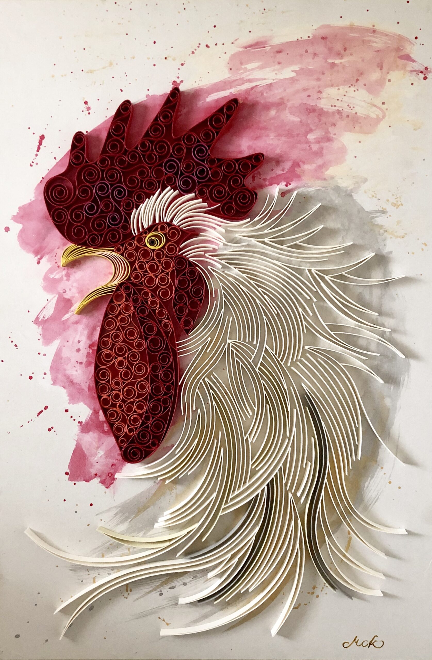 雄叫び かみばんどアート紙バンドを素材に生み出される、かみばんどアートの作品集です。私が描く文様を立体として紡ぎ出し、工芸と芸術が交差する表現を形にしました。その静謐な世界をご覧いただければ幸いです。 2025.09.032025.12.04 作品名/雄叫び2019年制作サイズ/90cm×60cm 第1回みやざき総合美術展入選 かみばんどアート作品№19 〈作品紹介〉 夜明けの静寂を破り、大地に響き渡る鶏の雄叫び。本作品「雄叫び」は、その力強い瞬間を紙バンドで表現したアート作品です。一本一本の紙バンドを丹念に配置し、鶏のしなやかな羽毛の質感、誇り高く伸びる首、そして魂を揺さぶるような雄叫びの迫力を描き出しました。白系と赤系の色で、朝日を浴びて輝く羽の美しさや、生命力あふれる姿が際立ちます。新しい始まりを告げる鶏の雄叫び。そのエネルギッシュな躍動感と紙バンドの温もりを、ぜひ感じてください。