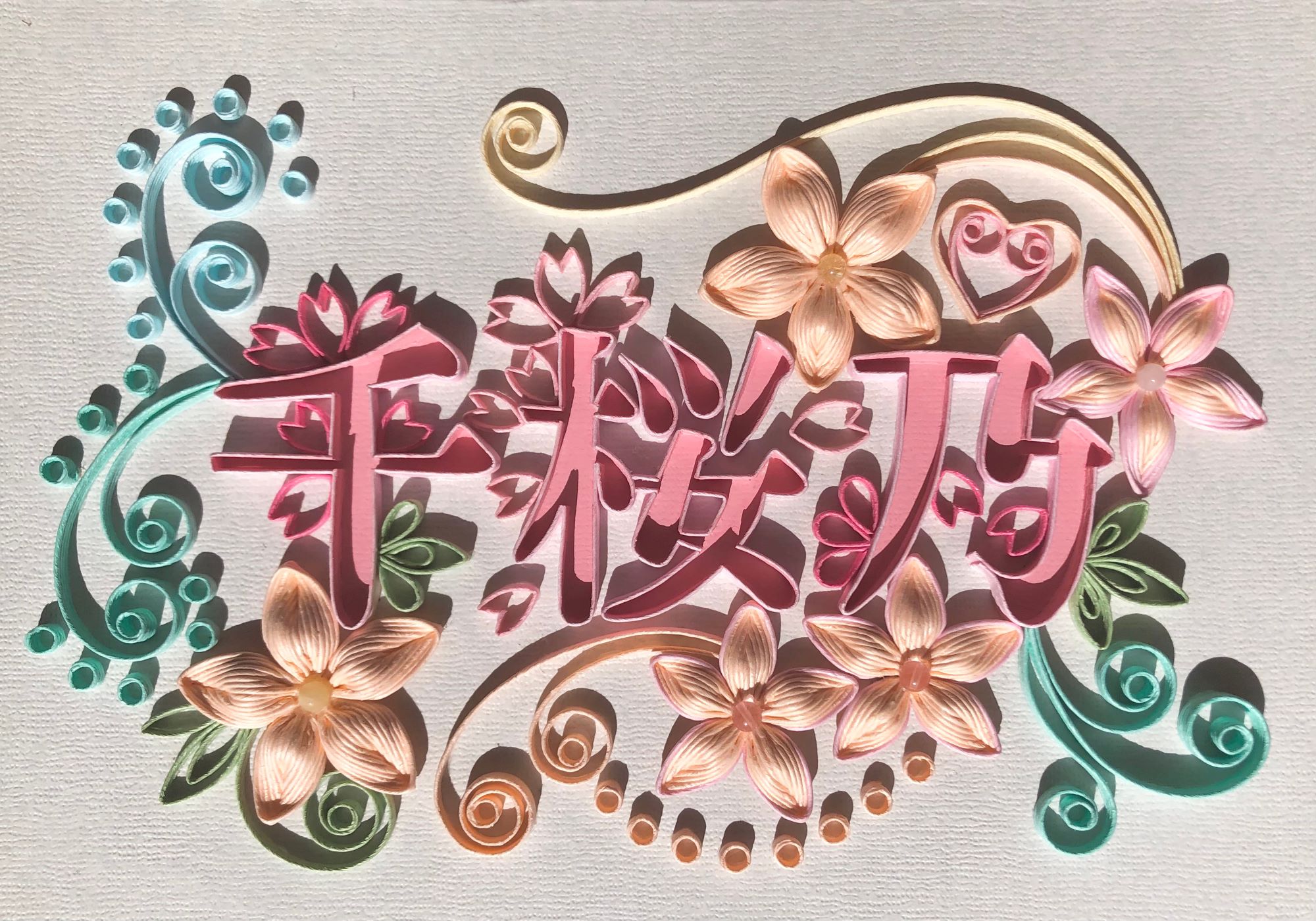 千桜乃 かみばんどアート紙バンドを素材に生み出される、かみばんどアートの作品集です。私が描く文様を立体として紡ぎ出し、工芸と芸術が交差する表現を形にしました。その静謐な世界をご覧いただければ幸いです。 2025.09.032025.12.04 作品名/千桜乃2022年制作サイズ/不明 かみばんどアート作品№26 〈作品紹介〉 「千桜乃」という文字を、やさしいパステルカラーの紙バンドで描いた春の訪れを感じさせるアート作品です。文字のまわりには、可憐な桜の形をした花々を丁寧に配置し、まるで春風に包まれているかのような柔らかな世界を表現しています。千の桜が咲き誇る情景をイメージし、淡い色合いが見る人の心を穏やかに癒します。紙の質感と繊細な造形が織りなす、春のやさしさが詰まった作品です。