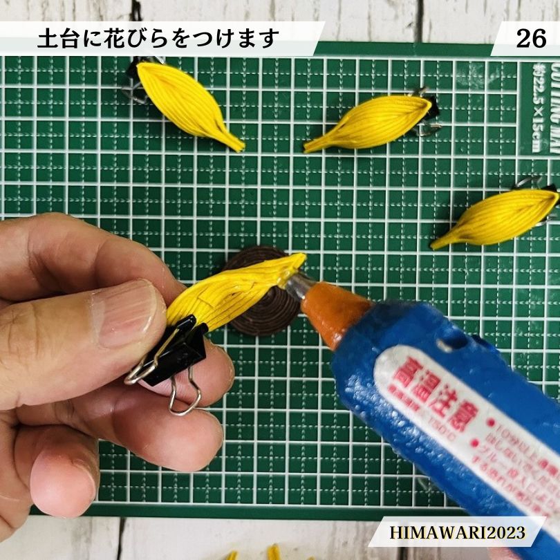 ・花びらの根元にホットボンドを付けます