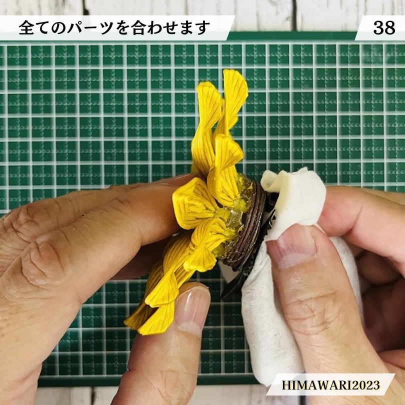 ・ブローチ台が熱くなるので、ウエットティッシュなどを使って、花びらの土台と接着します