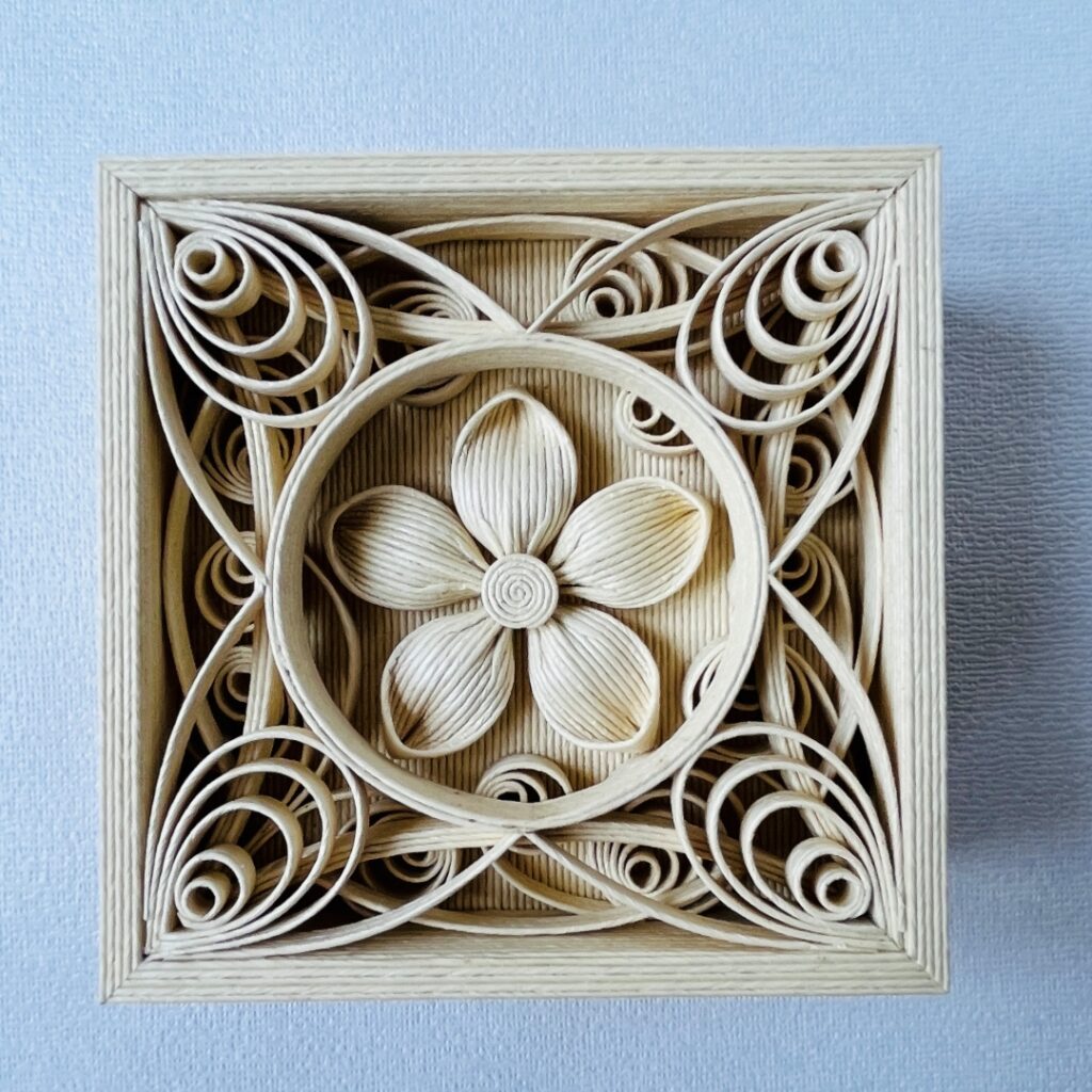 丹念に紙バンドを重ね合わせてつくられた小箱は、手仕事の温もりを宿しながら、用と美をあわせ持つ工芸品となります。ひとつひとつの線が重なり、形を成すその過程は、静かな積み重ねの時間そのもの。そこに宿る律動は、箱の内側に秘められた空間までも特別なものに変えていきます。